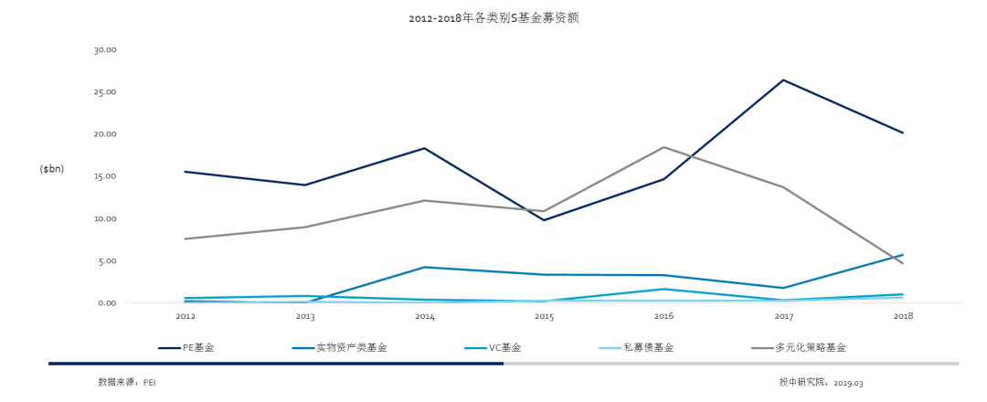 2、各类S策略基金中(包括PE基金、实物资产类基金、VC基金、私募债基金、多元化策略基金等),PE S基金募资规模处于领先位置(如下图)。